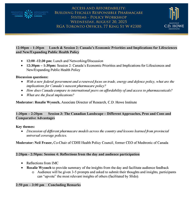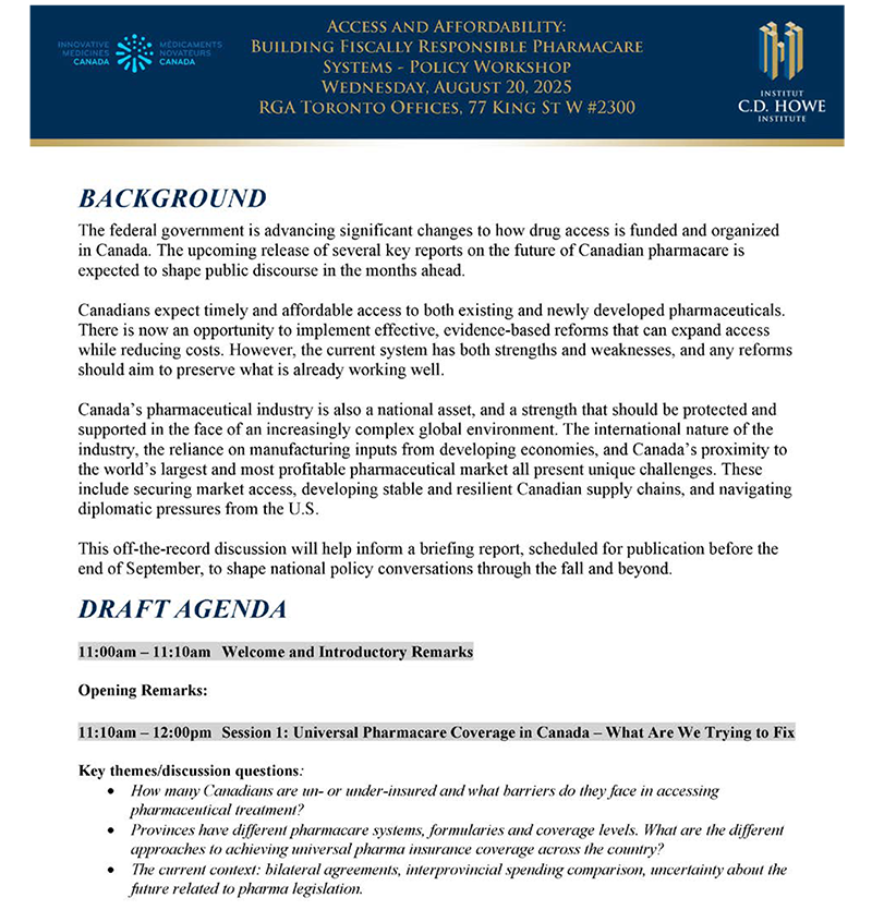 In August 2025, healthcare policy stakeholders convened in Toronto to address one of Canada’s most pressing healthcare policy challenges: developing a fiscally responsible approach to universal pharmacare that balances accessibility, affordability, and sustainability.11 Canada’s universal healthcare system does not include prescription drug coverage, but all provinces have public drug insurance programs. Each province covers different medications, and many have varying coverage levels depending on a number of sociodemographic factors such as age, household income, and employment status. The workshop, hosted by the C.D. Howe Institute, brought together government officials, industry representatives, academics, and policy experts to examine the current state of pharmaceutical coverage in Canada and chart a path forward for evidence-based reform.