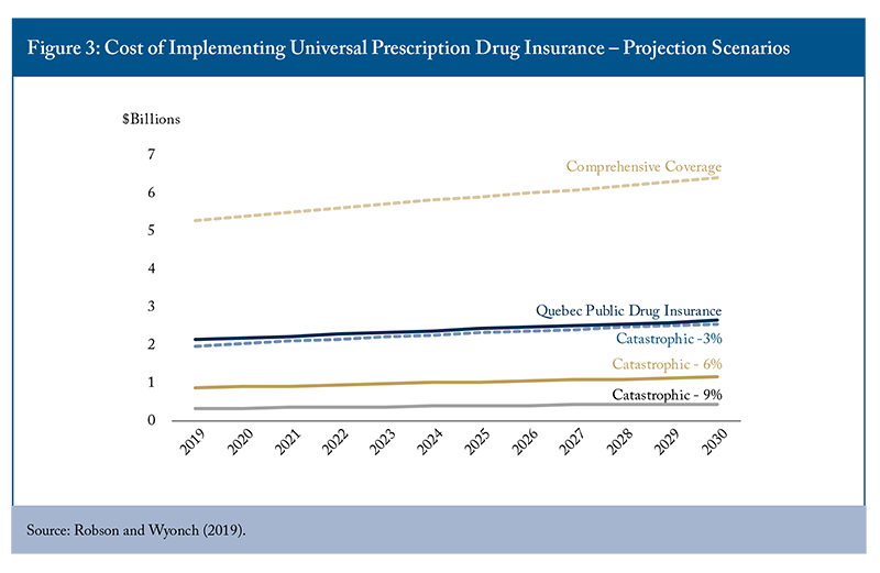 Cost projections indicated significant fiscal implications for different policy approaches, with fill-the-gaps comprehensive coverage expansion representing the most expensive option (though still less than half as expensive as first-payor universal comprehensive coverage).44 The Parliamentary Budget Office estimated that single-payer universal coverage based on the Quebec formulary would result in incremental costs of about $11.2 billion in 2024-25, increasing to $13.4 billion in 2027-28 (Barkova and Busby 2023). In contrast, the Quebec model (which includes premiums and copayments) and catastrophic coverage models offered more financially sustainable alternatives. The analysis highlighted Quebec’s mixed model as the more fiscally prudent option for achieving universal pharmacare coverage.55 Notably, Quebec regulates minimum coverage levels for private insurance in addition to public coverage, effectively creating a common universal minimum coverage level. Other provinces have shown little interest in regulating private insurance coverage in this manner. The Quebec model provides more comprehensive coverage than a catastrophic backstop on spending and is more fiscally sustainable than expanding similar coverage without the implicit cost recovery mechanisms.