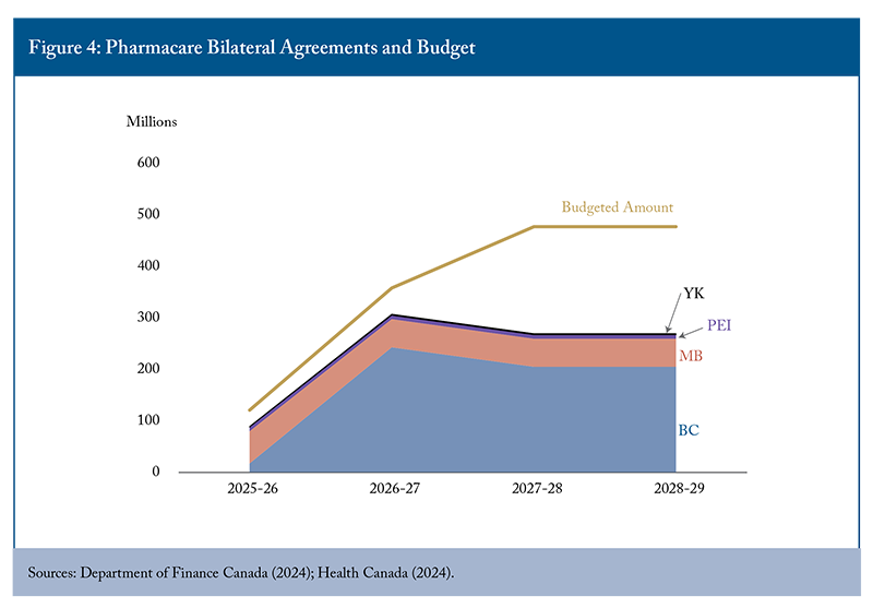 The presentations also highlighted uncertainty about program costs and implementation complexities. The 2024 federal budget allocated $1.5 billion over five years for diabetes and contraception coverage. The Parliamentary Budget Office (PBO), however, estimates that the five-year cost to the federal government will be $1.9 billion (Barkova 2024). This estimate does not factor in behavioural and market responses such as switching from uncovered to covered medications and assumes that existing provincial and private coverage will remain unchanged. In reality, the cost burden of covered medications has completely shifted to the public in Manitoba and Prince Edward Island (the provinces that have launched their new pharmacare programs), since insurers are not allowed to provide duplicative insurance. The three provinces and one territory with bilateral pharmacare agreements represent only 18 percent of the Canadian population, but cover 65 percent of allocated federal funding (Figure 4). The estimated costs of initial pharmacare implementation were overly optimistic, and the federal government under-budgeted for pharmacare rollout below that estimate. Only 35 percent of the budget remains for bilateral agreements with all remaining provinces. It is simply unrealistic for universal first-dollar coverage to be achieved with the current federal budget spending plans.