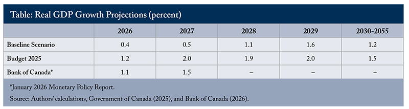Supply-side projections derived using a growth-accounting framework following Laurin and Drummond (2021) – combining Statistics Canada’s 2026 population outlook under a medium immigration scenario, Canada’s post-2000 productivity growth of 0.84 percent annually, and observed hours-worked patterns – point to real GDP growth of just 0.4 percent in 2026 and 0.5 percent in 2027. That is well below official projections (see Table).