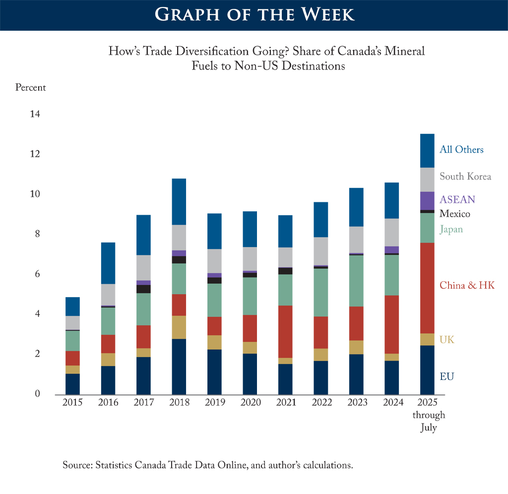 The share of Canada’s exports of mineral fuels and products* to non-US destinations has reached a historic high. Thanks to key energy transport infrastructure on Canada’s West Coast coming on stream in 2024 and 2025, Canada is able to fill additional demand, notably from China, which has been diversifying its own supplies away from the United States. International trade diversification is one way by which Canada can strengthen and de-risk its economy, as outlined by the C.D. Howe Institute’s Trade Crisis Working Group.