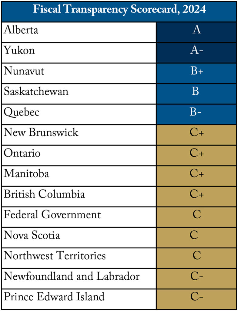 Alberta and Yukon topped the class in 2024 due to their timely releases, consistent accounting, and clear presentations. Both governments presented key figures early in their documents and released frequent in-year updates, allowing citizens and legislators to track fiscal performance against projections.