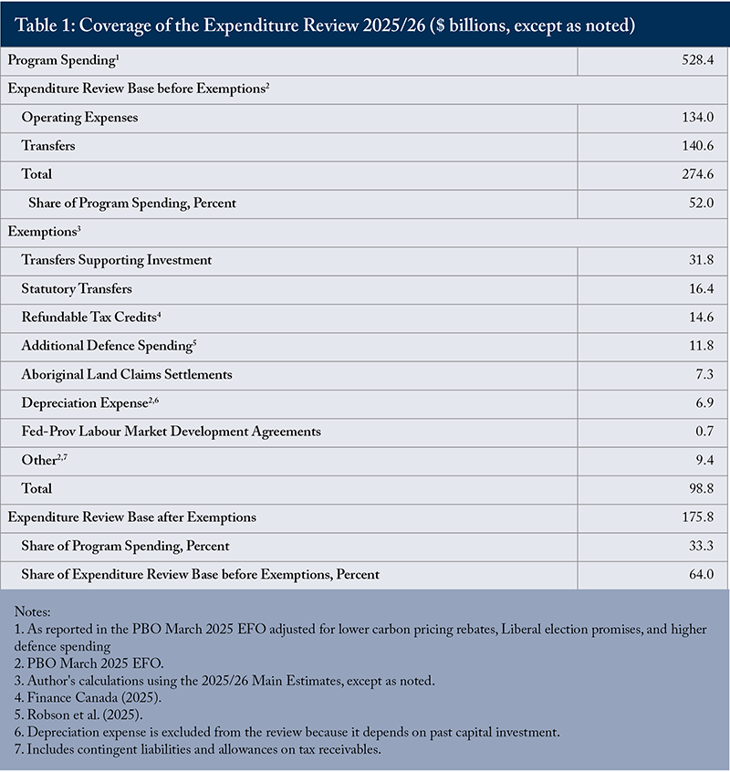 In addition to excluding approximately two-thirds of program spending, the review does not cover programs delivered through the tax system. Finance Canada (2025) reports that some $150 billion in tax revenue is forgone through tax credits, special deductions, and preferential tax rates that favour specific activities and types of income. Measures accounting for about two-thirds of this amount address problems such as the tax treatment of savings and income paid to non-residents, which makes them more of an issue for tax reform than for a spending review. The expenditure review should cover an estimated $54 billion in tax-based measures that are comparable in purpose and function to direct spending programs.5Author’s calculations based on a detailed review of the tax expenditure accounts. With this inclusion, the potential expenditure review base is $582 billion, of which the “comprehensive” expenditure review covers 30 percent.