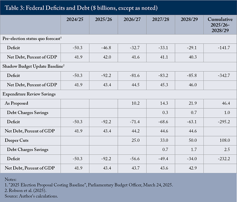 The federal “comprehensive” expenditure review was launched in early July through letters to ministers from the minister of finance. These letters were not made public, but various media outlets have prepared summaries. Based on these summaries, the review aims to achieve up to a 15 percent reduction in government operating expenditures in 2028/29. The government’s definition of operating expenditures appears to be compensation and other costs of running government departments, agencies, and Crown corporations, and “other transfers,” defined as total transfers less major transfers to persons and other levels of government. These expenses are almost half of program spending forecast for the current fiscal year, but I estimate that exemptions will reduce the coverage of the review to just under a third of program spending. As a result, the fiscal savings from the review will amount to about $22 billion in 2028/29, less than half the amount required to put federal finances on a fair and prudent path.