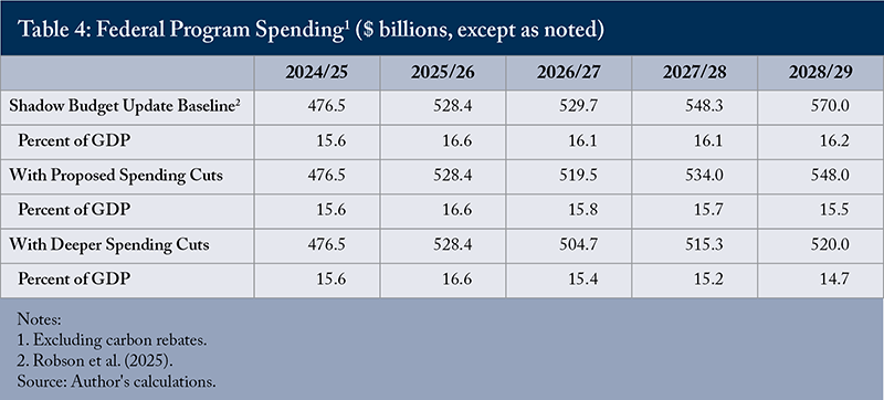The maximum $47 billion cumulative savings from expenditure review are not enough to prevent a rise in the debt ratio over the forecast horizon. Additional cumulative fiscal consolidation of approximately $60 billion is required to achieve a lower debt ratio in 2028/29 than in 2025/26. The additional consolidation could, in principle, be achieved by tax increases or further spending reductions. However, the recent election revealed a preference for tax reductions rather than increases. Further, the US has made permanent the tax cuts implemented in Trump’s first term, which will make increases in business taxes particularly damaging. Finally, the personal income tax burden on Canadians was the fifth highest in the OECD in 2022.1Source: the Organisation for Economic Co-operation and Development (OECD) Global Revenue Statistics Database https://www.oecd.org/en/data/datasets/global-revenue-statistics-database.html. The lower debt target should therefore be achieved through further spending reductions (see Table 3, “Deeper cuts” scenario). This “deeper cuts” scenario would reduce program spending as a share of GDP to 14.7 percent in 2028/29 (Table 4), which is slightly above its average from 2014/15 to 2019/20. Program spending would be approximately unchanged from 2025/26, but would still be 9 percent higher than in 2024/25.