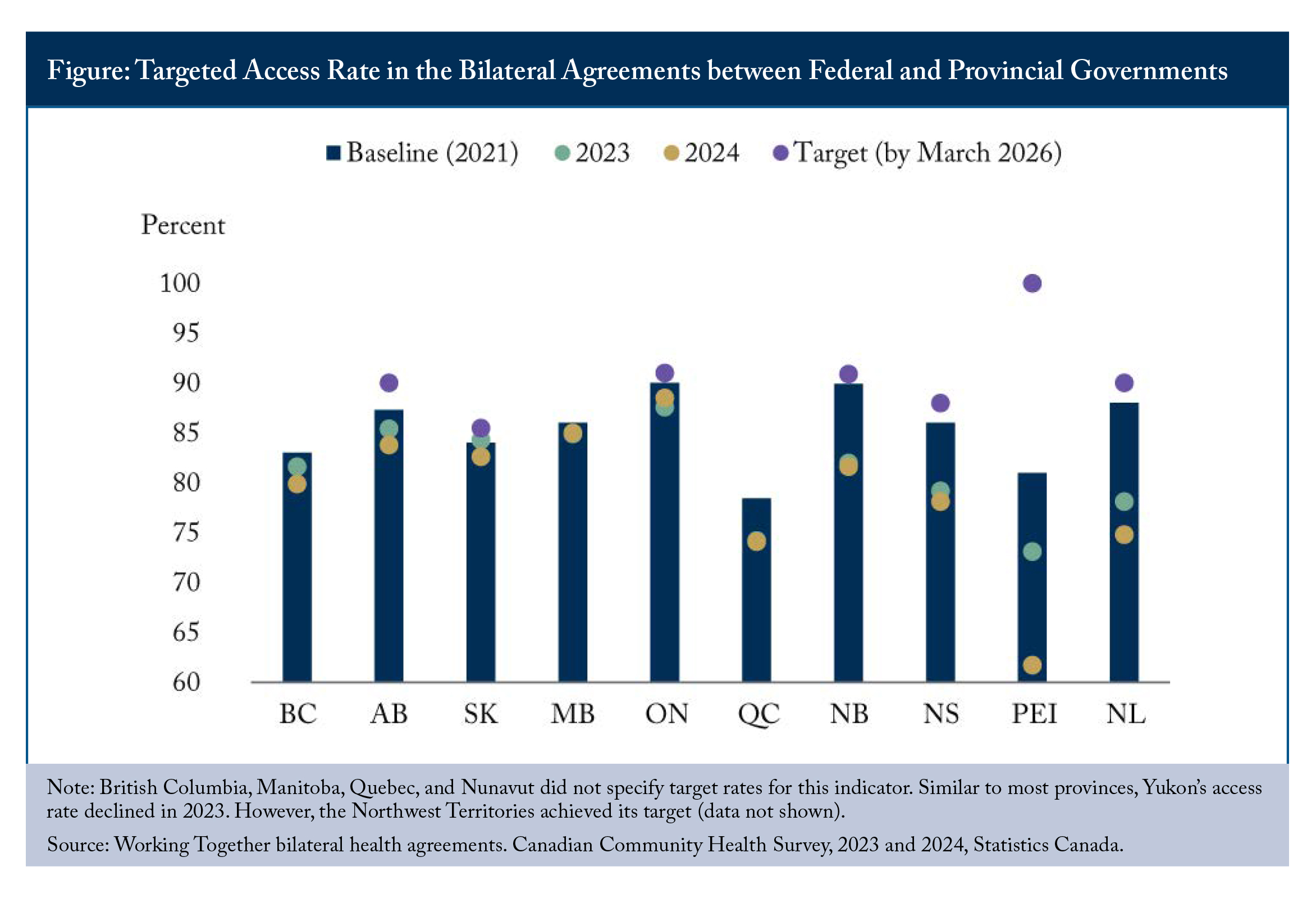 The framework sounds rigorous, but performance keeps deteriorating. Most provinces set modest targets: improving access rates by just one to three percentage points. Yet the 2023 and 2024 Canadian Community Health Survey data reveal that many provinces experienced declining access rates after baselines were established (see Figure). Rather than narrowing the access gap, the distance between current performance and bilateral commitments is widening. This makes the target even more unapproachable.