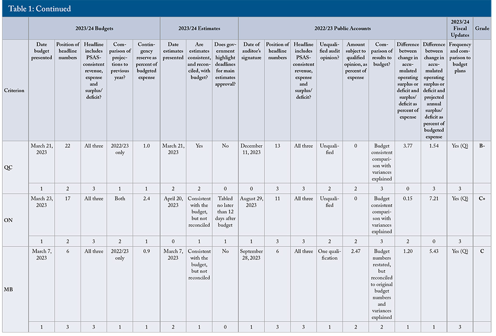 Next were New Brunswick, Ontario, Manitoba and British Columbia with C+ grades. New Brunswick’s financial statements explained variances between results and original budget projections, but its budget provided no comparison of projections to actual prior results. Ontario’s budget compared projections to both the year about to end and the latest results, included a modest contingency fund and a reserve, and had high-quality public accounts. Main estimates released after the start of the fiscal year and a large gap between its projected and actual change in accumulated operating deficit kept it from achieving a higher score. Manitoba and British Columbia both had timely budgets and consistent accounting across their documents. Both provided quarterly fiscal updates with comparisons to budget projections. Manitoba received a qualified opinion from its auditor. British Columbia’s large contingency reserve and multiple qualifications from its auditor hurt its grade.17Manitoba’s auditor noted that the comparison of 2022/23 results to the previous year was not consistent, and wanted more disclosure of contractual obligations. For consistency, we evaluated governments based on items referenced in the auditor’s opinion for the 2022/23 financial statements, even if the main focus of the qualification was not on that year.