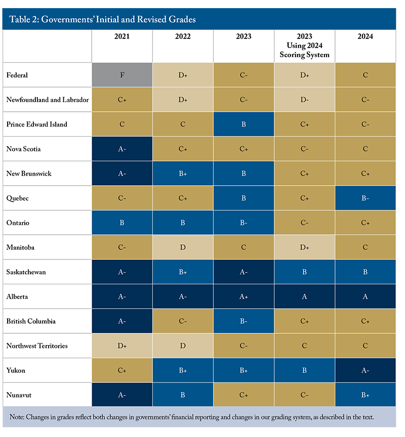 - In this year’s report card – which covers year-end financial statements for fiscal year 2022/23, and budgets and estimates for 2023/24 – Alberta and Yukon topped the class with grades of A and A– respectively. Nunavut earned a B+, Saskatchewan earned a B grade, while Quebec received a B–. New Brunswick, Ontario, Manitoba and British Columbia earned grades of C+. The federal government, Nova Scotia and the Northwest Territories earned Cs. At the bottom of the class were Newfoundland and Labrador, Prince Edward Island with grades of C–.