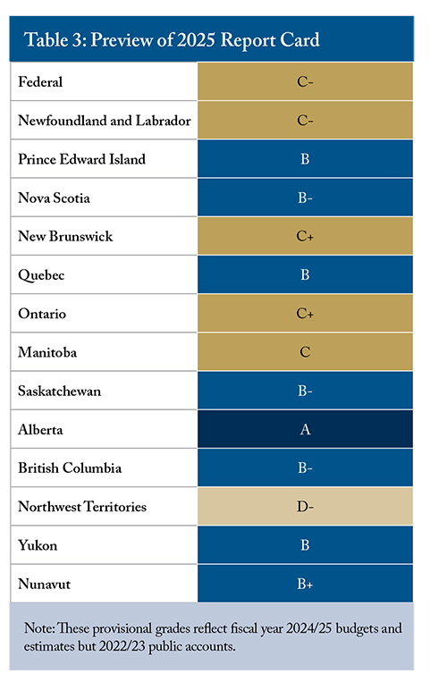Table 3 shows our preliminary grades for next year’s report card. The grades reflect an update of the scores in Table 1, using fiscal year 2024/25 budgets and estimates, assuming each government’s performance on its 2023/24 public accounts (not all of which were available at the time of writing) will be the same as its performance in 2022/23. The final scores will depend on the timing and quality of each government’s public accounts, but judging from performance through the early part of the fiscal cycle, Ottawa would get a C- next year; Alberta would top the class again with an A.