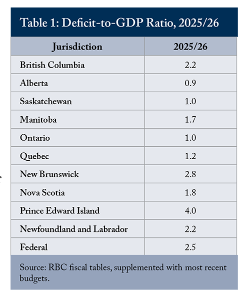 Since Mason’s article, New Brunswick released a budget that shows a steep rise in its debt burden over the next four years. Quebec released a budget that showed a return to balance by 2029/30 – but that result, required by provincial law, depends on an unrealistically buoyant economy and major unidentified savings. Ontario released a budget that, notwithstanding its own inexplicably robust economic projections, features a higher debt ratio by the end of the decade. Prince Edward Island released a budget that prefigures a jump in its debt ratio. The federal government has also announced a fuel tax suspension – a multi-billion-dollar boondoggle that will add to its already excessive debt. All jurisdictions project deficits for 2025/26, with seven of them projecting deficits of at least 1.5 percent of GDP (Table 1).