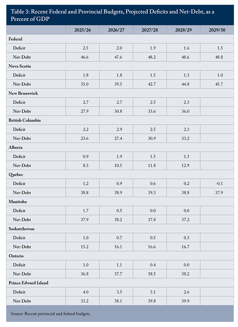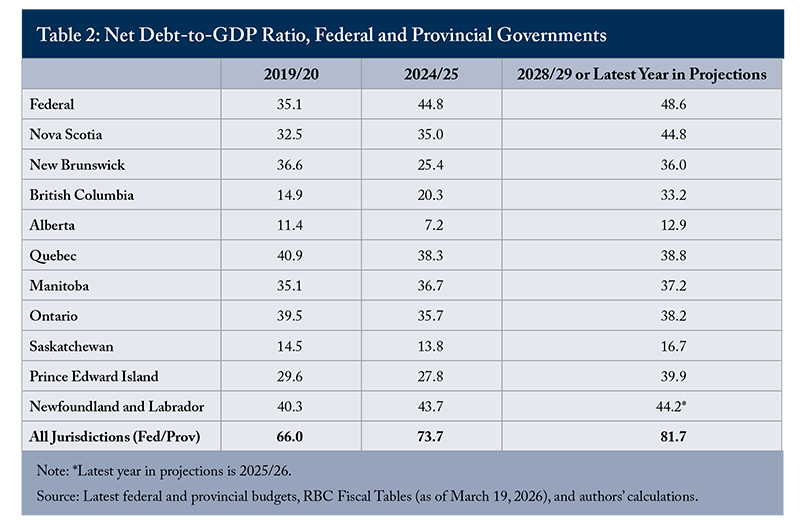 Projections in 2026 budgets released so far show chronic deficits and rising debt for years (Table 3). Nova Scotia, New Brunswick, British Columbia, Alberta, and Prince Edward Island had small deficits or even surpluses into the 2020s, but now all project sharply higher debt burdens. Quebec’s projected decline rests on shaky numbers, and Ontario projects a higher one. If the definition of insanity is doing the same thing over again while expecting a different result, Gary Mason’s comment about the death of fiscal sanity is spot on. We are repeating the excesses of the 1980s and early 1990s, and we are suffering the consequences.