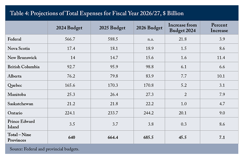 Table 4 compares projected total expenses for 2026/27 in 2026 budgets (and the federal government’s budget last fall) to projected expenses for that year in previous budgets. All show overshoots from previous projections. Quebec’s 3.1 percent overshoot is the smallest, while Alberta and New Brunswick’s overshoots exceed 10 percent. Across the nine provinces, projected 2026/27 expenses are $45.5 billion, or 7.1 percent, higher than they were in 2024. These overshoots reflect policy decisions: higher program spending and deficits that drive up interest payments.