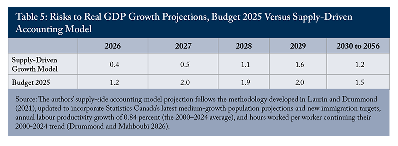 Table 5 compares real GDP growth projections in the 2025 federal budget with supply-driven estimates based on new immigration targets and post-2000 trends of labour productivity and hours worked.