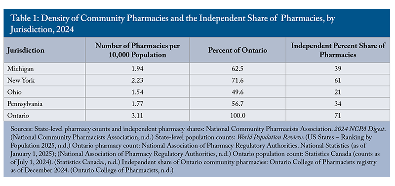 As Table 1 indicates, the pharmacy density in states surrounding Ontario ranges from 50 to 70 percent of Ontario’s density. In Ontario, over 70 percent of community pharmacies are independently owned and less than 30 percent are corporately owned. The share of pharmacies that are independent in the four US states is markedly lower. Independent pharmacies represent about 35 percent of all US community pharmacies.4545 National Community Pharmacists Association. 2024. NCPA Digest. Columbus, OH: NCPA. October 27. https://pharmacybookshelf.cardinalhealth.com/view/491779965/2/. Thus, even with its use of closed specialty drug PPNs, the Canadian drug benefits system evidently more generously reimburses pharmacies than does the US system.4646 Canada also has a relatively high density of pharmacies compared to its international peers. There are three pharmacies per 10,000 population in Canada and two pharmacies per 10,000 population in the US. By comparison, the density of pharmacies per 10,000 in two commonwealth countries, Australia and the UK, is 2.3 and 2.1, respectively. See: OECD. Health at a Glance 2023: OECD Indicators. Paris: OECD Publishing. https://doi.org/10.1787/7a7afb35-en.