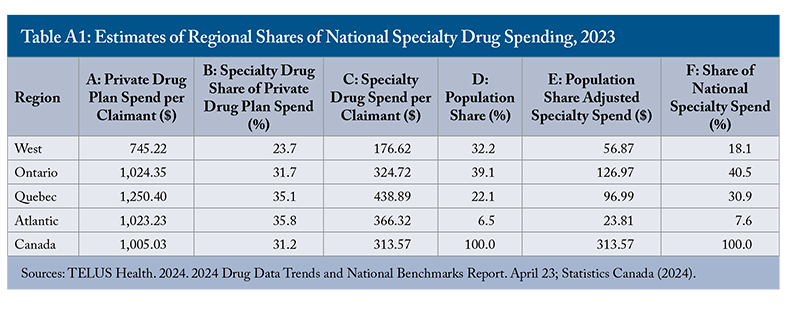 Because Quebec has banned PPNs, we need to remove the Quebec share of this national spending to estimate specialty drug sales in provinces where they are allowed. To do so, I use regional private drug plan spend data for 2023 reported by Telus Health (Table A1).6868 TELUS Health. 2024. 2024 Drug Data Trends and National Benchmarks Report. April 23. https://go.telushealth.com/hubfs/telus-health-drug-trends-report-2024-en.pdf?hsLang=en-ca.