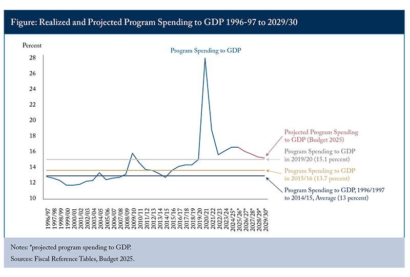 Instead, program spending as a ratio of GDP soared to 28.1 percent in the pandemic of 2020/21. It has been coming down since. By 2029/30, the last year in the 2025 Budget’s projection, there will have been nine years to bring spending as a portion of the economy back to a reasonable benchmark. But, at 15.3 percent, the 2025 Budget is planning a 2029/30 ratio that is still higher than it was in 2019/20, 2015/16 and the average of 1996/97 to 2014/15.