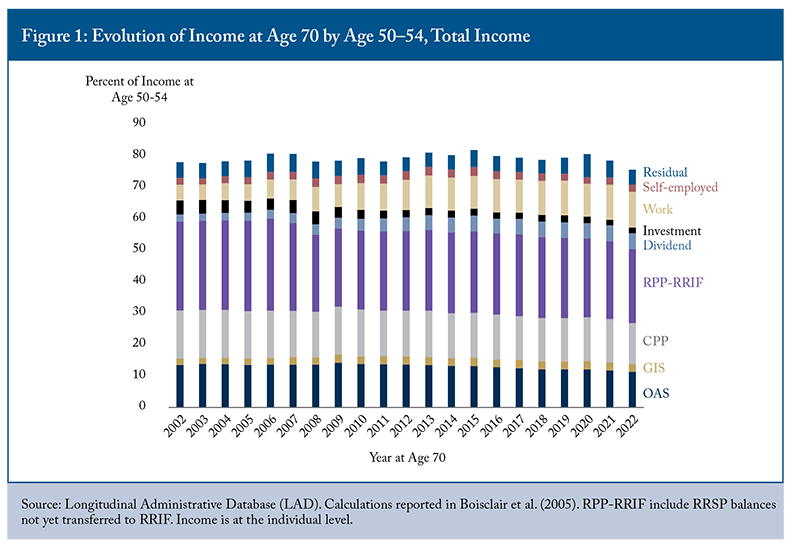 This is great news: on average, Canadian households now have a higher net worth. Part of this additional net worth has helped, and will continue to help, Canadians maintain their standard of living over their lifetimes, especially in retirement. To illustrate this, we use the Longitudinal Administrative Database (LAD), enabling us to follow T1 tax data at the taxpayer level. Each year, we identify those aged 70 and look back at their incomes when they were likely at their earnings peak: around ages 50 to 54. We show replacement rates by source of income at age 70 (as shown in Figure 1).