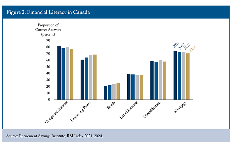 In Canada, the most recent evidence we have comes from the Retirement and Savings Institute (RSI Index), which asks the working-age population about both general financial knowledge and knowledge of the retirement income system.55 Information on the index can be found at https://ire.hec.ca/en/index. Figure 2 illustrates the share of respondents over the past four years who could correctly answer simple questions covering key dimensions of financial literacy – such as compound interest, purchasing power (inflation), the relationship between bond values and interest rates, compound interest on debt, risk diversification, and mortgages. For most questions, fewer than two-thirds of respondents answered correctly, and the needle is not moving fast – if at all. These are basic questions. To keep the analogy going, this is akin to being able to perform simple tasks in the cockpit. Overall, over these six questions, just over half (53 percent) answered more than three questions correctly.66 Previous research has obtained similarly low levels of financial literacy using different samples. For example, Boisclair et al. (2017) report that only 42 percent can answer correctly the questions on compound interest, purchasing power, and diversification. The first study we are aware of was performed by Mullock and Turcotte (2012).