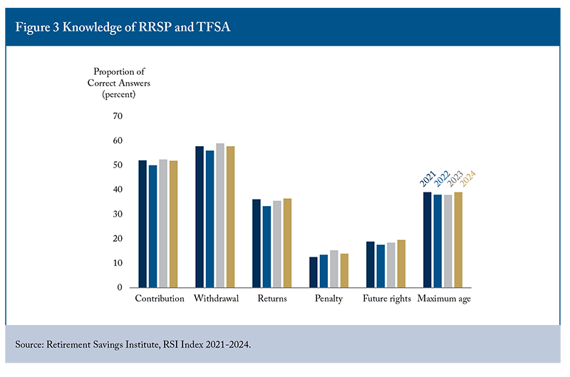 Another dimension of financial literacy is how workers factor taxes into their choices. Our retirement income system features a third pillar, which involves saving through tax-assisted savings vehicles, namely, a registered retirement savings plan (RRSP), and a tax-free savings account (TFSA). Their tax treatment is different. While RRSPs feature tax-exempt contributions and taxable withdrawals, TFSAs do not provide a tax deduction for contributions and do not tax withdrawals. They also differ on several dimensions. Figure 3 reports statistics from the RSI Index on knowledge of RRSPs and TFSAs. Understanding of the tax treatment of contributions, returns, and withdrawals is limited. Many believe there are penalties for withdrawing from RRSPs and TFSAs early. Most do not understand how future contribution rights work. Overall, less than 26 percent of workers get more than three questions correct (out of six).