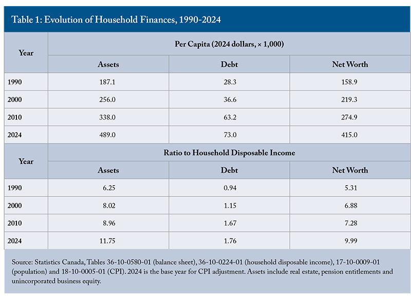 To appreciate what is at stake, it helps to look first at how much consumers must manage financially and how that has changed. Using national balance sheet data from Statistics Canada, we can trace the assets, debt, and net worth of households since 1990, both on a per capita basis and as a ratio of household disposable income. The trend is clear: households have far more to deal with today (Table 1). Between 1990 and 2024, real net worth grew from $158,900 to $415,000 – a more than twofold increase.11 This includes life insurance and pension assets. This growth has outpaced income gains: in 1990, net worth represented 5.3 times household disposable income. By 2024, it had reached 10 times that level.22 Means may be distorted by the skewness of the wealth distribution, and the rise in inequality could explain the increase. But the rapid increase is also seen with medians. See, for example, Bedard and Michaud (2021) and Boisclair et al. (2025).
