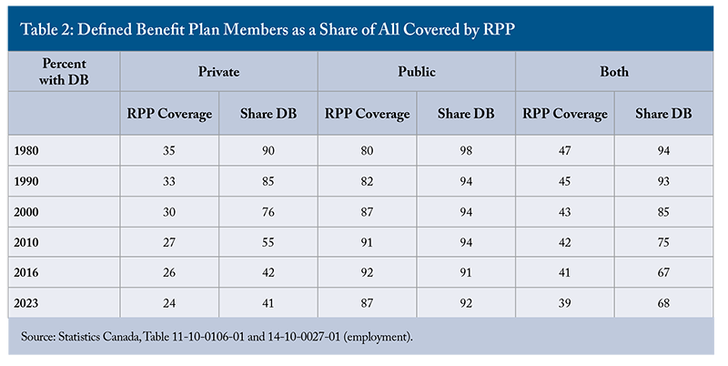 The landscape is changing rapidly for employer-sponsored Registered Pension Plans (RPPs). Coverage in the private sector has continued to erode. It’s always been low despite high hopes when the retirement system was first established. In 1980, 35 percent of private sector workers were covered by an RPP (Table 2, column 1). Today, coverage has fallen to fewer than one in four workers.