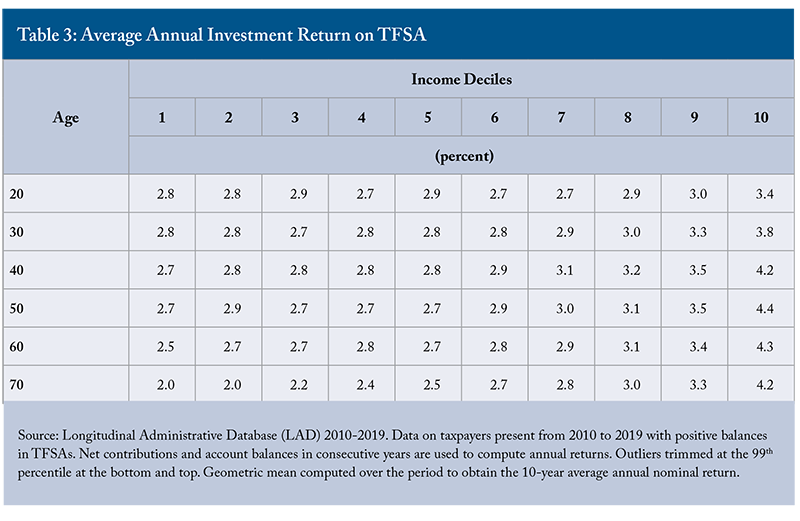 Table 3 reports these nominal returns. The first striking observation is how low they are. In a 2019 survey of the Retirement and Savings Institute, respondents were asked what share of their TFSA holdings was invested in stocks (Boyer et al. 2022). The average stock share was 40 percent. Over that period, a hypothetical portfolio composed of 40 percent stock (MSCI World Index) and 60 percent short-term Government of Canada bonds would have produced an average annual return of 4.6 percent. This is significantly more than the return we observe in Table 3, except for the top income decile after age 40 (and even then, the hypothetical portfolio earns more). In other words, actual returns for TFSA holders saving for retirement are considerably lower than might be expected.77 Based on the same survey, the share invested in stocks is 60 percent for RRSPs (Boyer et al. 2022).