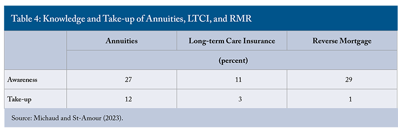 The point is that there are risk management solutions available, but they are underutilized, mainly because of complexity, cost, and retirees’ lack of awareness (Michaud and St Amour 2023). Advice may also be perceived to be expensive or hard to access. As shown in Table 4, less than 30 percent knew of annuities and reverse mortgages in 2019, and less than 11 percent knew of LTCI. Take-up is even lower: less than 12 percent have purchased life annuities, less than 3 percent LTCI, and less than 1 percent reverse mortgages. Clearly, decumulation is not on automatic pilot either, and although retirees may be somewhat aware of the risks looming ahead, they are ill-equipped to mitigate these.