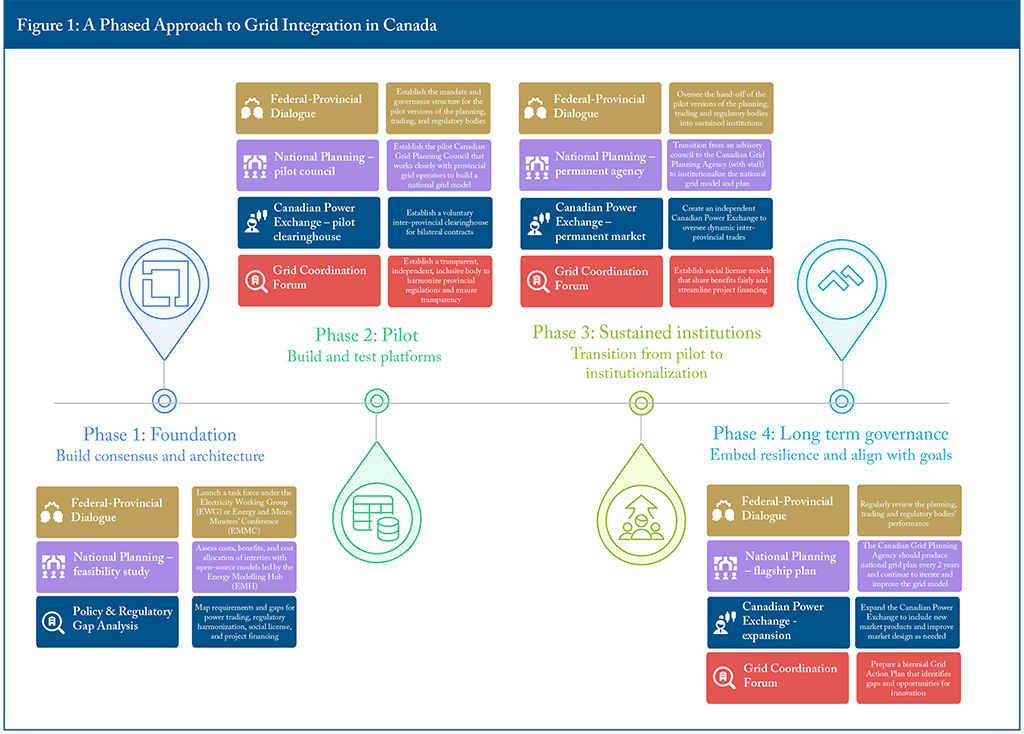 The first phase establishes the groundwork for sustained grid integration and power trading across provinces. It focuses on three activities: launching a federal–provincial task force, conducting a policy and regulatory gap analysis, and completing a modelling feasibility study. These steps set the stage for Phase 2, which will launch three pilot institutions: a Canadian Grid Planning Council to integrate provincial plans into a unified national plan, a Canadian Power Exchange as a central clearinghouse for electricity trading, and a Grid Coordination Forum to promote regulatory consistency. Each of these pilots could evolve into permanent institutions in Phase 3.