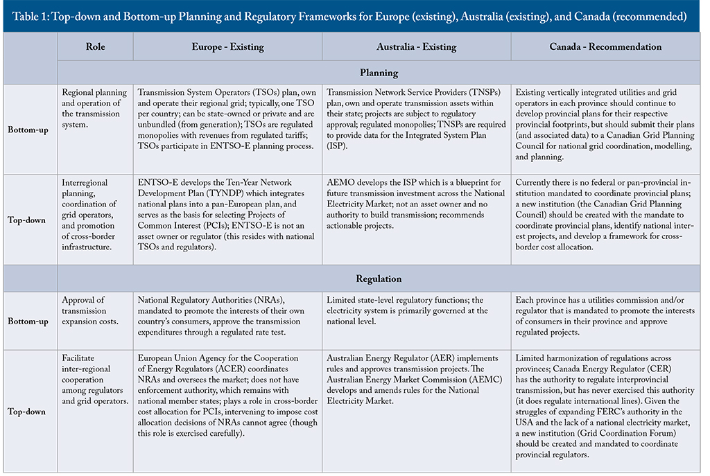 Each of these organizations should combine top-down and bottom-up governance to fit within Canada’s existing institutional landscape, where grid planning, operation, and ownership are the responsibility of individual provinces, each with its own planner, operator, and regulator. A strong belief that federal intervention, in what is viewed as a provincial matter, would be unacceptable has long been a major barrier to integrating provincial power grids. However, as Europe and Australia demonstrate, it is possible to preserve provincial autonomy while federal coordination enables integration. Europe and Australia faced similar tensions and developed governance structures that balance cross-border planning and regulatory harmonization without overstepping regional authority. The table below illustrates how Canada could draw from these models.