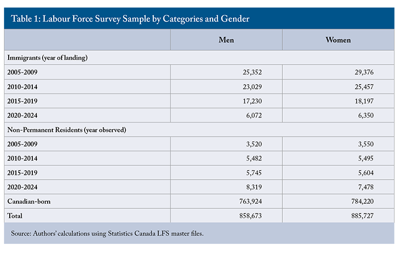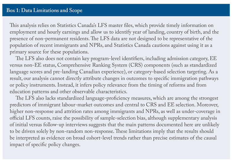 In addition, the master files allow us to identify foreign-born individuals who have never been landed immigrants, i.e., permanent residents. While this group is comprised mostly of NPRs, it also includes foreign-born individuals who were Canadian citizens at birth, such as children of foreign diplomats and armed forces personnel.7In the 2021 census, foreign-born individuals who were Canadian citizens at birth comprised 0.9 percent of the population (322,530 of 36,228,480) and 19.8 percent of the foreign-born population who are not landed immigrants. See: Statistics Canada Table 98-10-0361-01. The subset of naturalized citizens is, however, relatively stable over time, so changes in the relative labour market outcomes of this group are more likely to reflect changes in the NPR population whose relative size grew dramatically over the sample period. While subject to the limitations summarized in Box 1, the LFS master files remain the only available source for analyzing relative immigrant earnings outcomes through 2025.