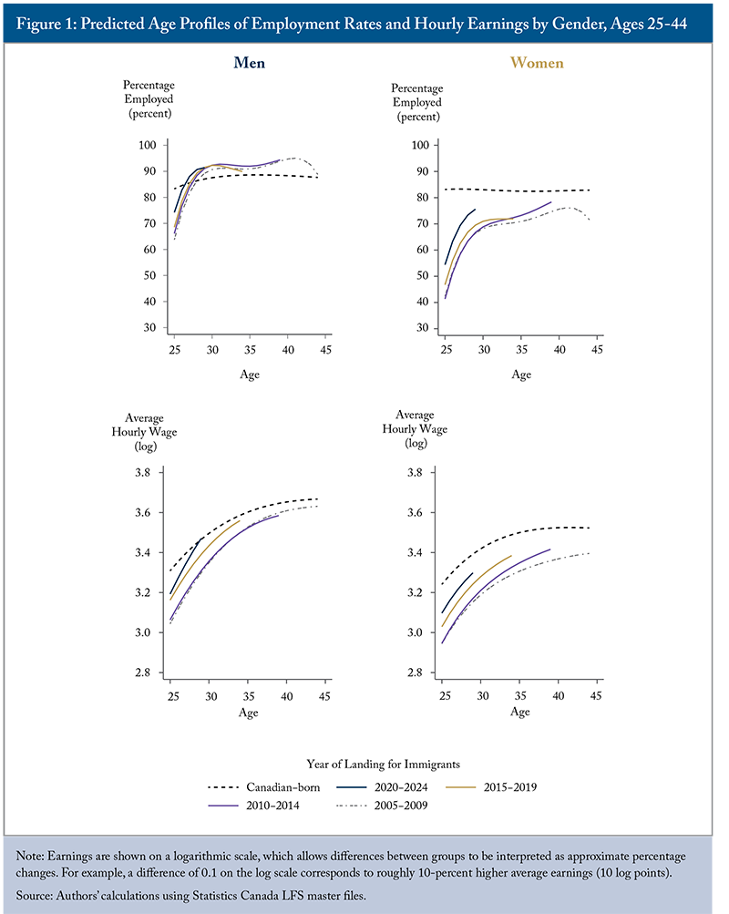 In this Commentary, we use the master microdata files of the Labour Force Survey (LFS) to estimate the relative employment rates and average earnings of new Canadian permanent residents, as well as non-permanent residents (NPRs), up to December 2024.4Crossman, Hou and Picot (2021) estimate relative weekly earnings of immigrants using LFS data from 2015 to 2019. Most recently, Champagne, Long and Pouline-Moore (2025) examine changes in the relative hourly earnings of non-permanent residents using LFS data between 2015 and 2024. Besides providing more timely data, the LFS reports hourly (rather than weekly or annual) earnings. Differences in hourly rates of pay are more likely to reflect labour productivity and less likely to reflect differences in hours of work and unequal access to full-time jobs. Data on hourly earnings are, therefore, better at capturing the impact of immigration on average human capital (skills, knowledge and experience), which is the key mechanism through which immigration can boost economic growth (Doyle, Skuterud and Worswick 2025).