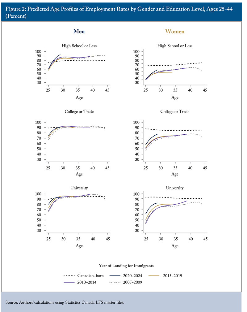EE primarily prioritizes applicants with the highest human capital characteristics, especially high levels of education and superior English or French language proficiency. Figure 2 presents employment-age profiles by education level for three groups: (i) high school or less; (ii) college diploma or trade certification; and (iii) university degree. These results allow us to assess whether the improvements observed in Figure 1 reflect a shift in immigrant selection to applicants with higher education levels and, in turn, higher employment rates and earnings, or whether similar gains are evident within the education group.