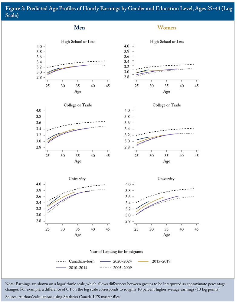 Figure 3 presents the corresponding hourly earnings profiles for each education group. The results for the least educated group suggest little to no improvement in the earnings potential of more recent landing cohorts. This is especially true for immigrant men, where a persistent shortfall of roughly 20 percent in average hourly earnings appears virtually identical for the 2005-2009 and 2020-2024 landing cohorts. For immigrant women, there is some indication of faster earnings growth for the most recent landing cohort, but the differences between cohorts are statistically indistinguishable.