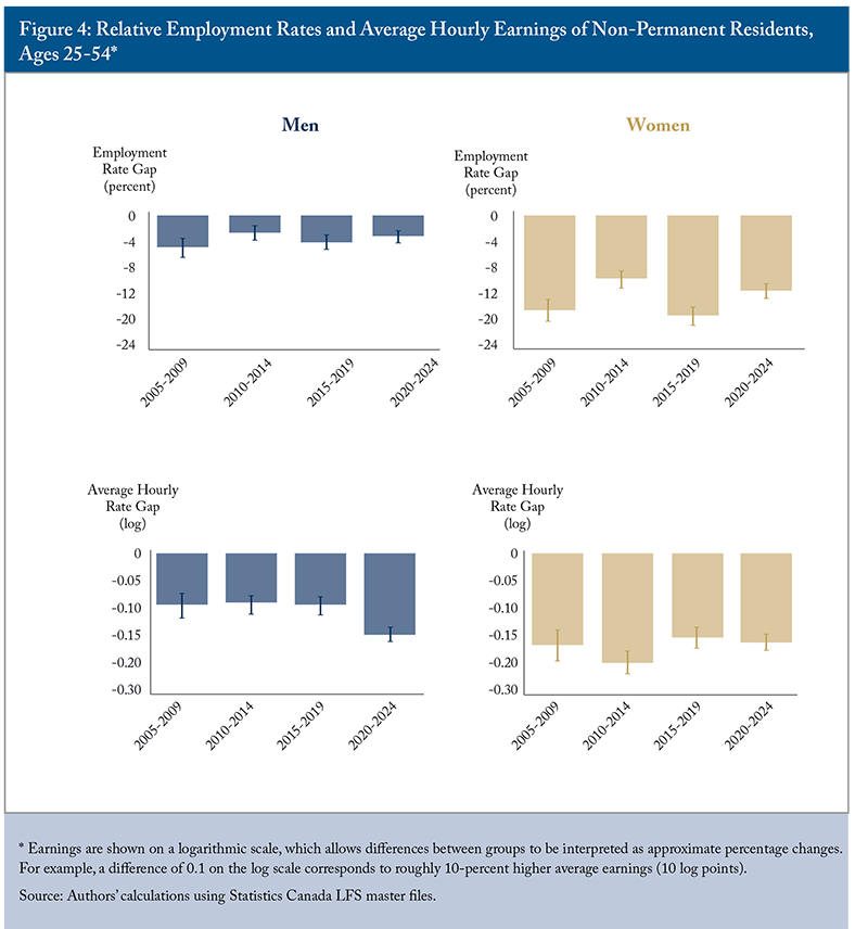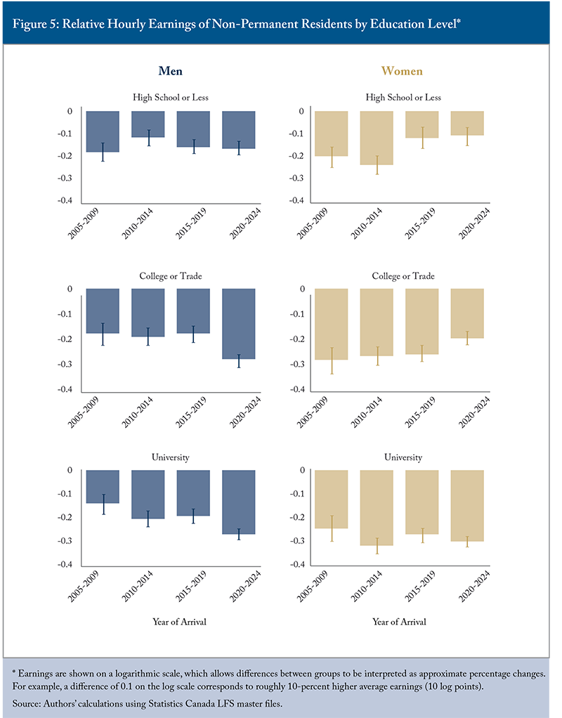 - Nonetheless, the results also point to a sharp deterioration in the average hourly earnings of non-permanent resident men in 2020-2024, particularly among college-educated men. Policies that prioritize this population for permanent residency in the years ahead risk undermining the gains of the past decade.
