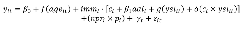 where yit is either a binary employment indicator or the log hourly earnings of individual i observed in month t; f(ageit) is a quartic in individual i’s age when sampled in month t; immi is a dummy variable indicating whether individual i is a landed immigrant; ci are fixed effects for the immigrant landing cohort i; aali is age at landing; ysli is years since landing; npri is a dummy variable indicating whether individual i is an NPR; pi are fixed effects for the period in which NPR i is sampled; γt is a full set of year fixed effects; and εit is a random error term with mean zero and variance. Since hourly earnings are not identified for self-employed workers, we restrict the wage regressions to paid employees. Both the landing cohort (ci) and NPR period (pi) fixed effects are grouped into the following four groups: 2005-2009, 2010-2014, 2015-2019, and 2020-2024.14Identification relies on the assumption, standard in the immigrant cohort literature, that contemporaneous macroeconomic conditions and other economy-wide developments affect immigrants and the Canadian-born similarly. Under this assumption, such shocks are absorbed by the year-fixed effects, while immigrant-landing-cohort-fixed effects capture persistent differences across immigrant cohorts relative to the Canadian-born.