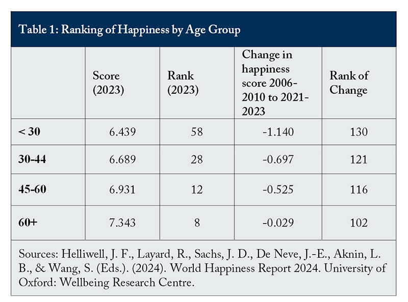 Happiness rankings improve with age. For people 60 years of age and older, Canada ranked eighth (Table 1). Older Canadians have had relatively consistent happiness scores since 2006, though there has been a slight decline. It’s a different story for Canadians under 30, whose happiness has fallen further than young people in 130 other nations. The only countries with a worse decline are Jordan, Venezuela, Lebanon and Afghanistan.